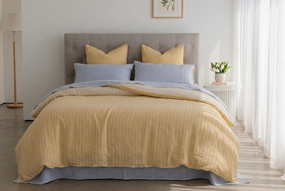 The interplay of Ciel and Soleil represents the balance we all crave—the cooling calm of a French horizon paired with the grounding warmth of sun-drenched stripes. Whether you are wrapping yourself in the architectural texture of our quilted blankets or sinking into the buttery softness of our yarn-dyed cotton, the intent remains the same: to help you glow softly and sleep deeply.